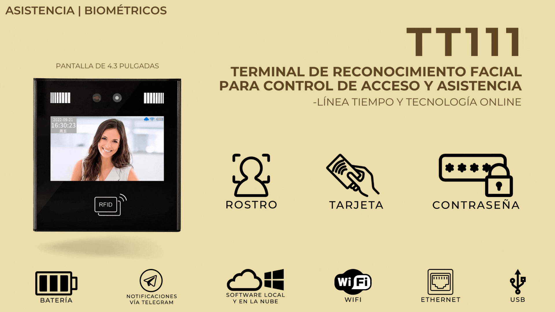 El modelo TT111 ofrece diversos métodos de verificación para el control de asistencia o acceso y cuenta con batería de respaldo.